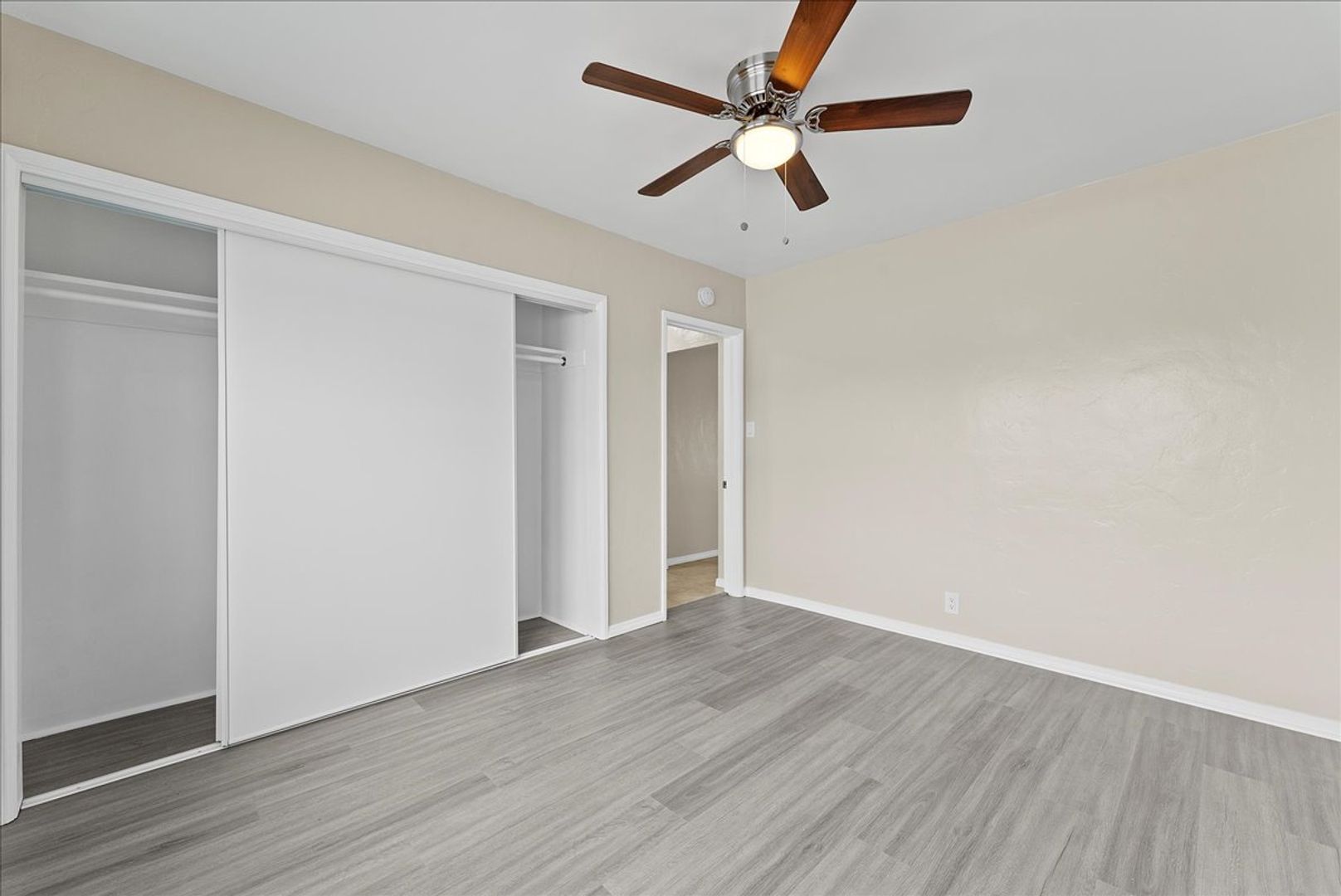 The hallway provides added practicality with built-in storage shelves and cabinets, helping you stay organized with ease. The generously sized bedroom includes a ceiling fan and a large closet with sliding doors, offering both comfort and ample storage. The property features controlled access for peace of mind and is pet friendly, welcoming both dogs and cats.