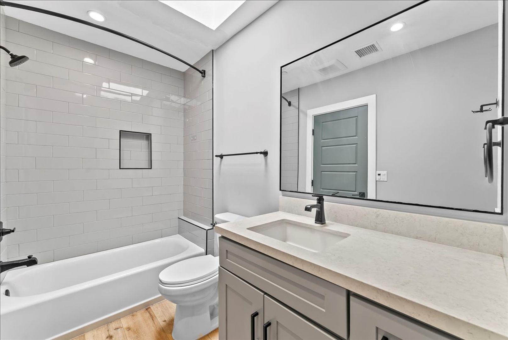 The living room opens wide and bright, perfect for cozy movie nights or a cheerful dining space with friends. The bedroom feels calm and peaceful, with built-in closets, beautiful hardwood floors, and a private en-suite bathroom that’s both roomy and relaxing. You’ll love the large vanity, big mirror, glowing recessed lights, and the soft sunlight that pours in from the skylight. Plus, your stackable washer and dryer are right inside—how easy is that?