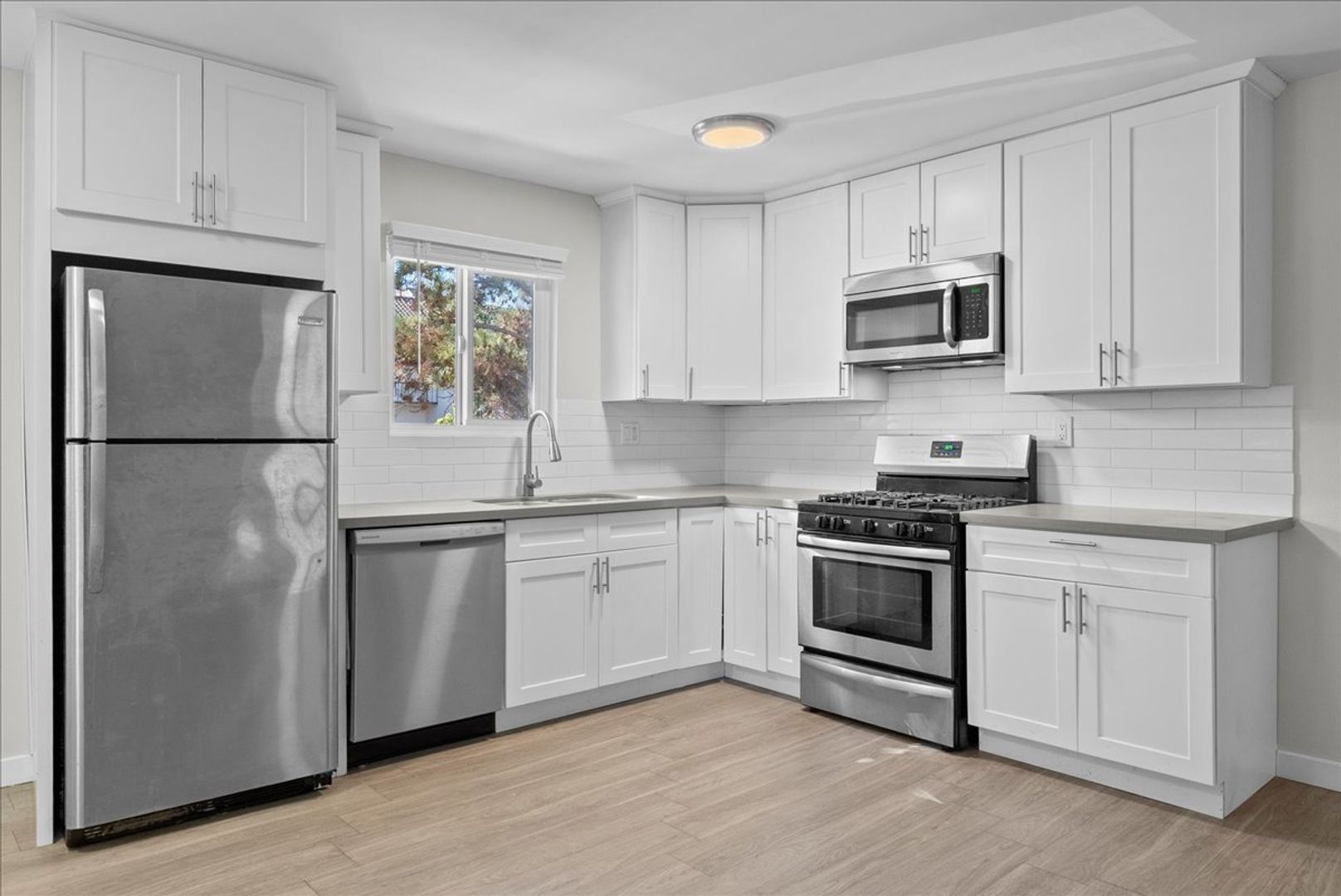 As you move into the heart of the home, the kitchen and adjoining dining area take center stage. The kitchen features an L-shaped layout with brand-new, modern cabinetry offering plentiful storage, generous countertop space, and a full stainless appliance package including stove, refrigerator, microwave, and dishwasher. The nearby dining nook flows seamlessly from the kitchen, inviting casual meals or intimate dinner conversations with ease.