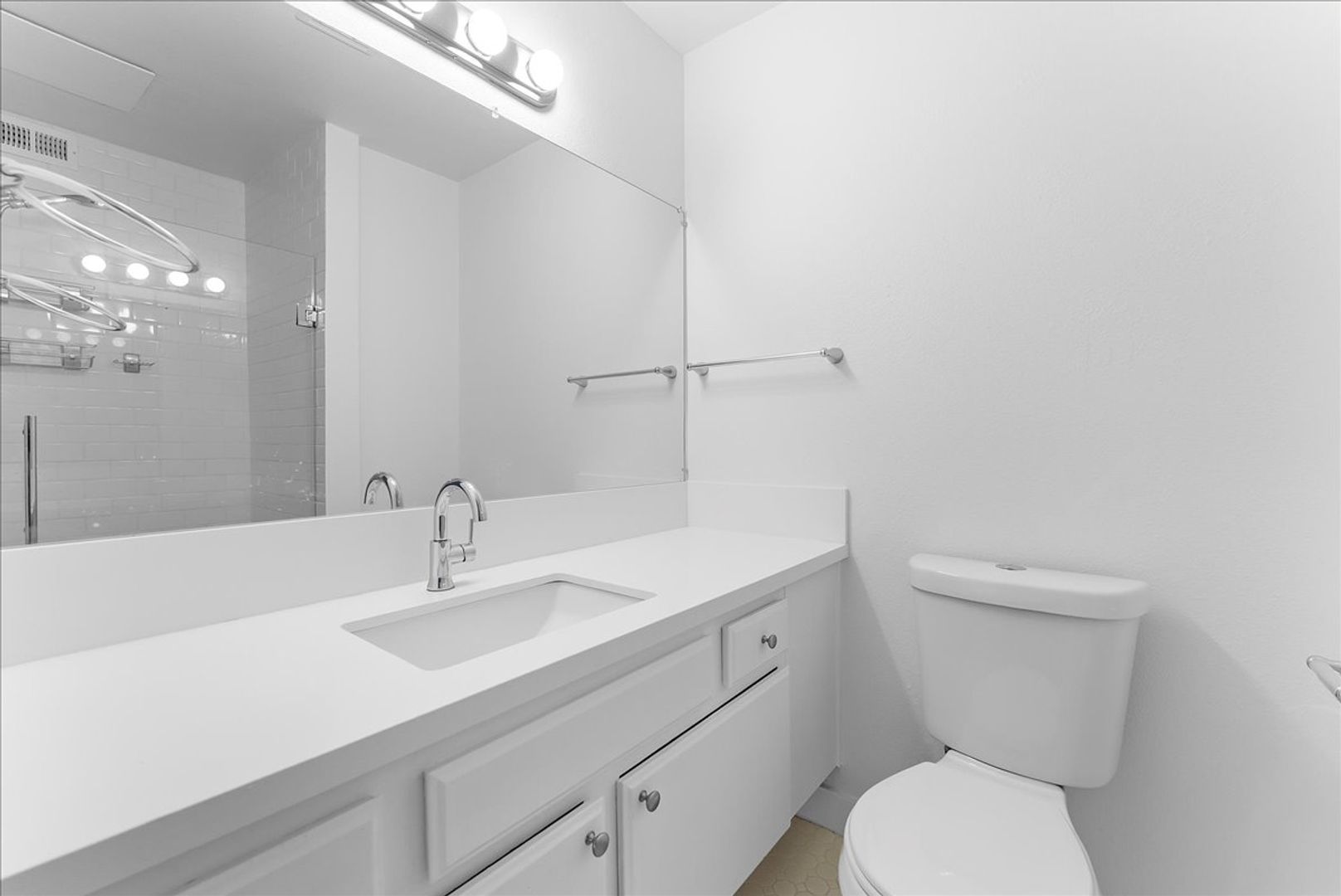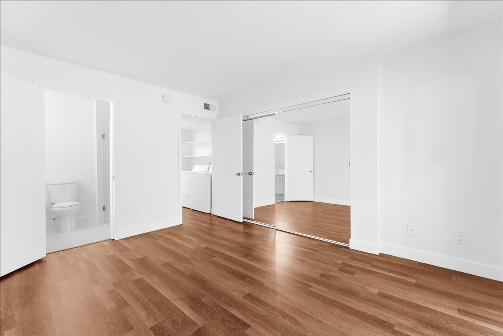 Beyond the kitchen, you'll find an expansive living and dining area, and a private patio that spans the entire width of the apartment—perfect for unwinding after work or hosting intimate gatherings with friends and family. Down the hall, you'll discover in-unit laundry for your convenience, as well as the main hallway bathroom. The two bedrooms are separated for added privacy, with the master featuring an en-suite bathroom and built-in closets with mirrored sliding doors.