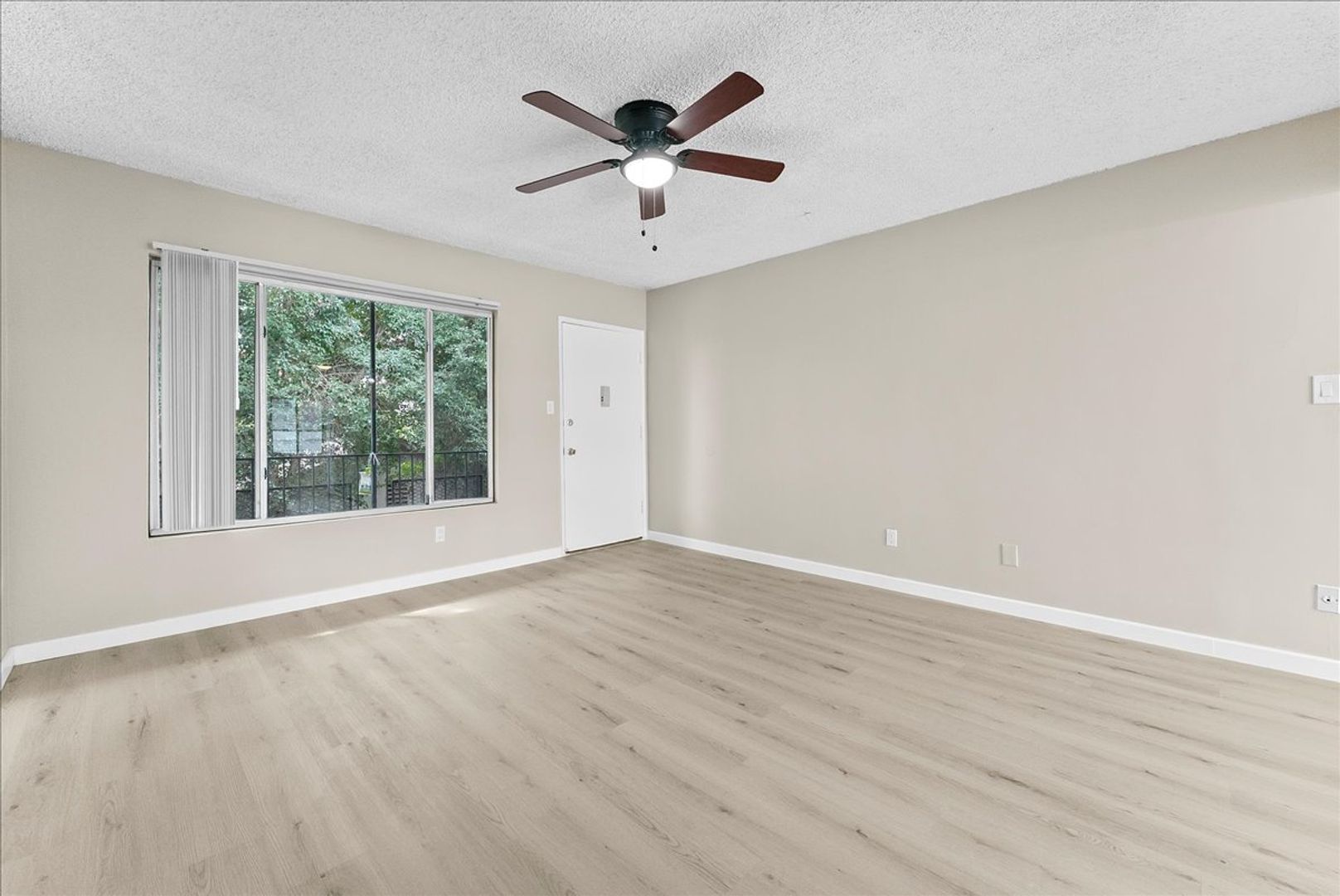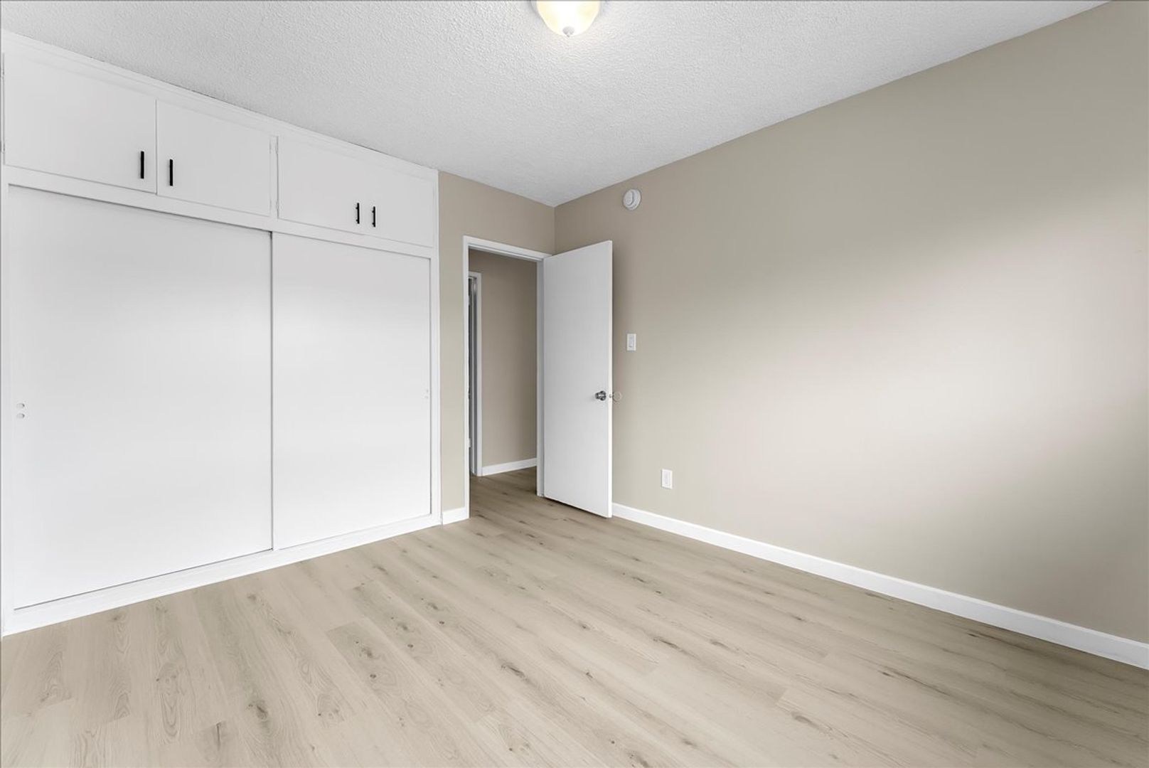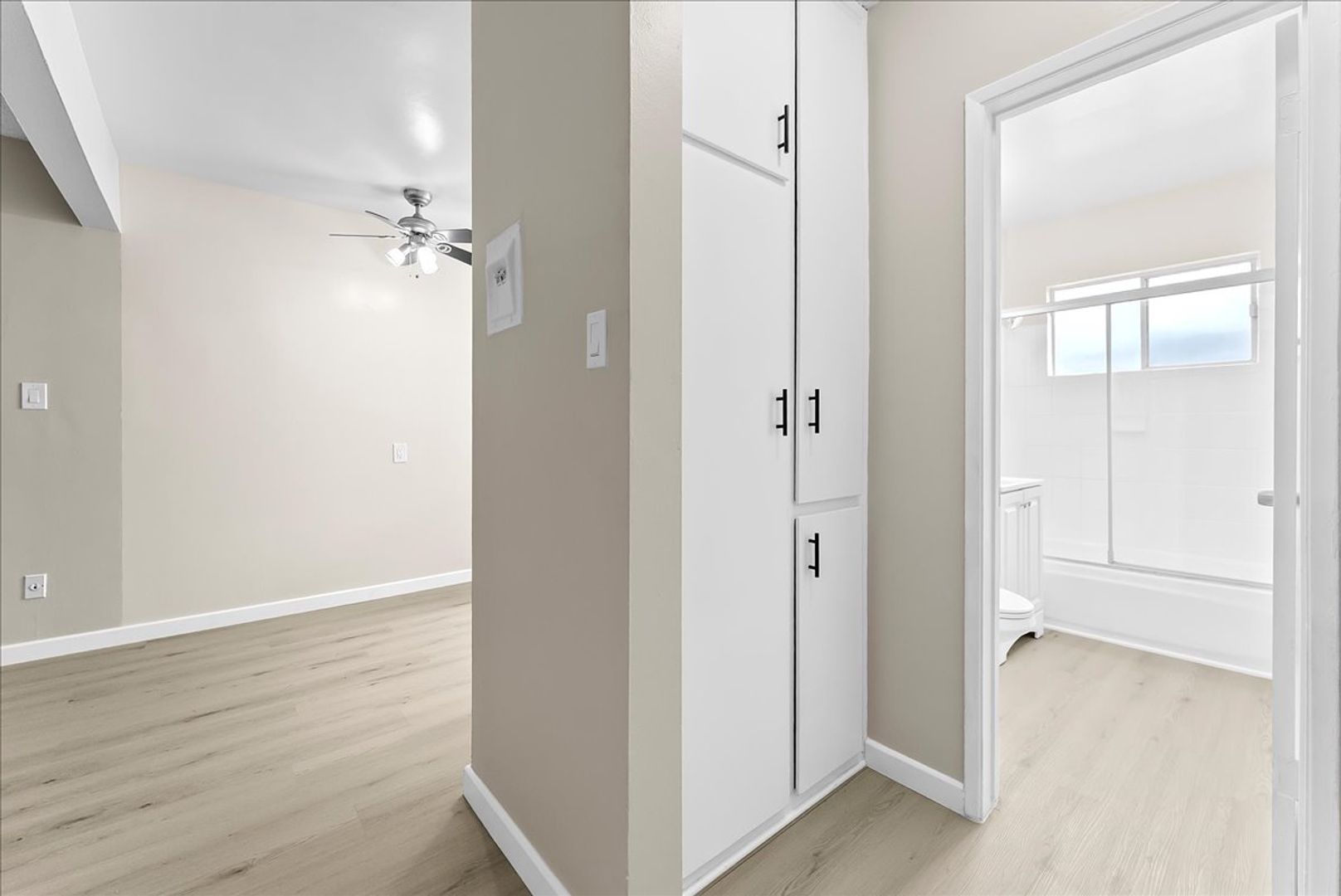 Fresh new floors flow throughout, complemented by ceiling fans for breezy comfort and wall heat for cozy evenings. A convenient hallway storage closet sits just outside the bathroom, making organization easy. Both bedrooms are generously sized and offer built-in closets with upper storage cabinets, giving you all the space you need without sacrificing style.