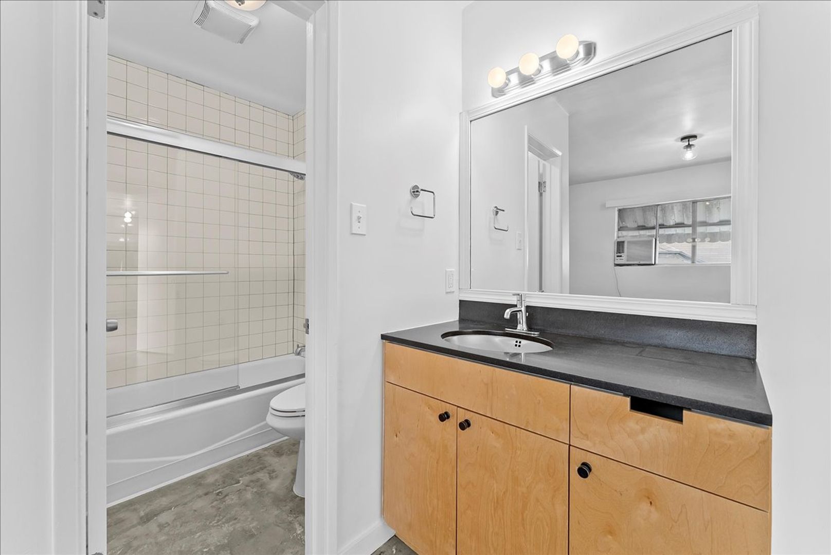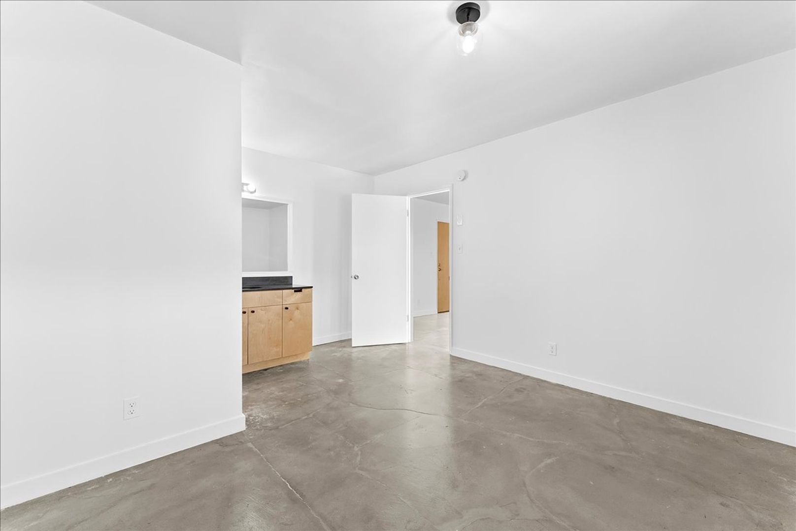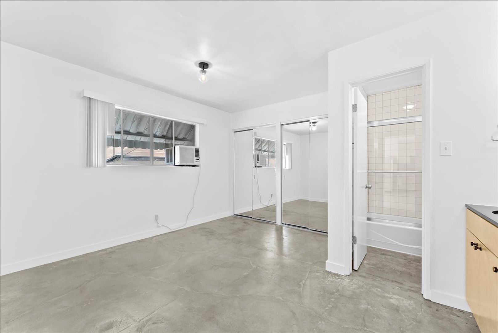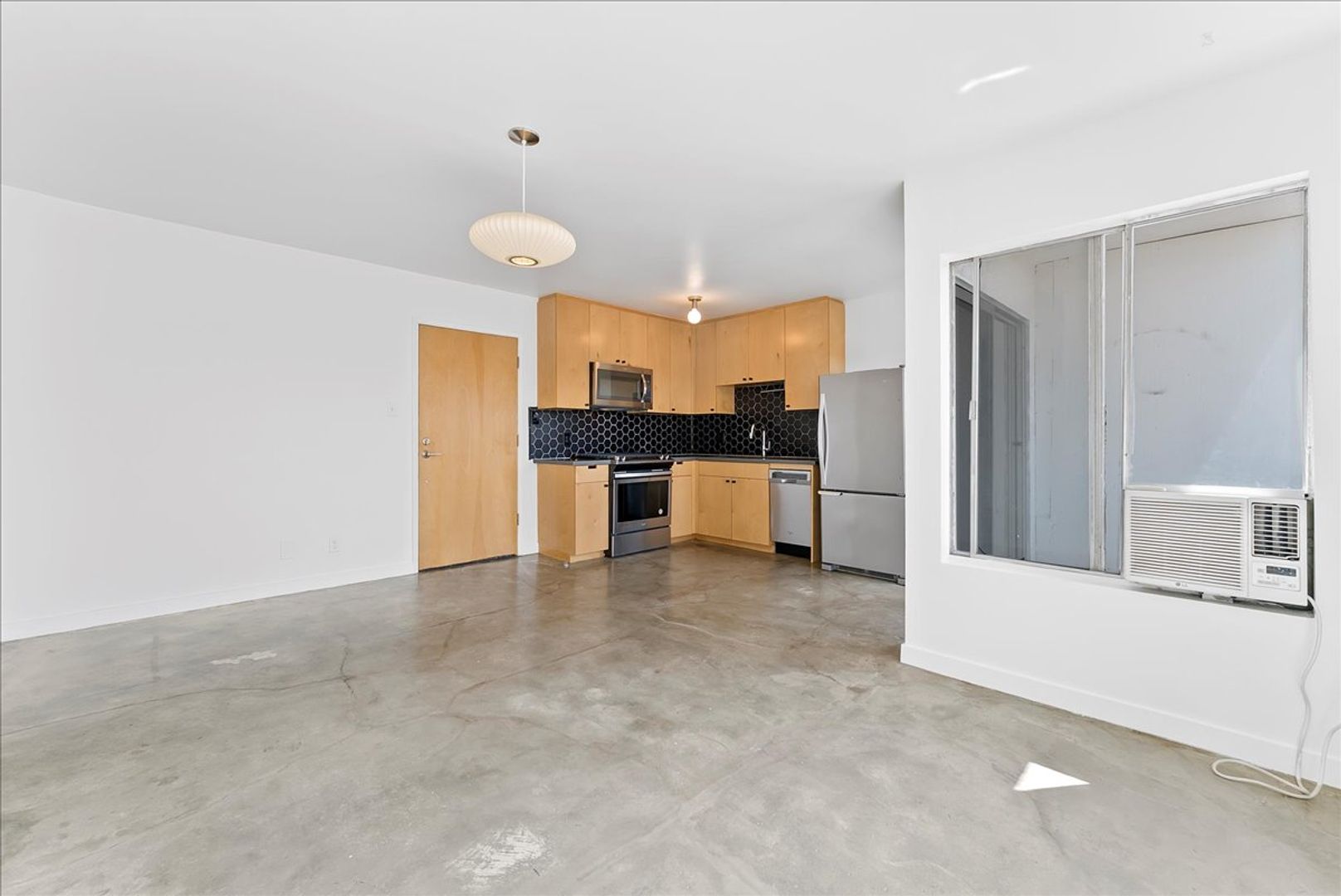 As you enter you'll be welcomed with an open floor plan with exposed cement floors, modern kitchen cabinetry, and private balcony. The kitchen features a two-tone design with light wood cabinets, black countertops, black octagon shaped tile backsplash, and stainless steel appliances. The bedroom features a spacious layout with sliding mirror door closets and ensuite bathroom. This beautiful apartment comes with one parking space and laundry facilities on site.