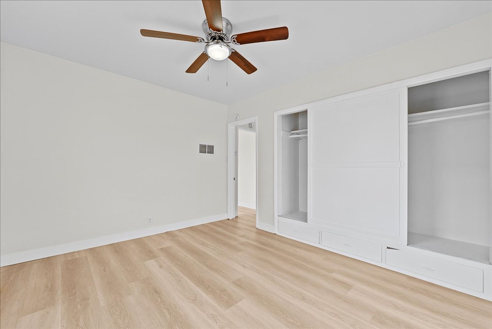 The hallway provides added practicality with built-in storage shelves and cabinets, helping you stay organized with ease. The generously sized bedroom includes a ceiling fan and a large closet with sliding doors, offering both comfort and ample storage. The property features controlled access for peace of mind and is pet friendly, welcoming both dogs and cats.