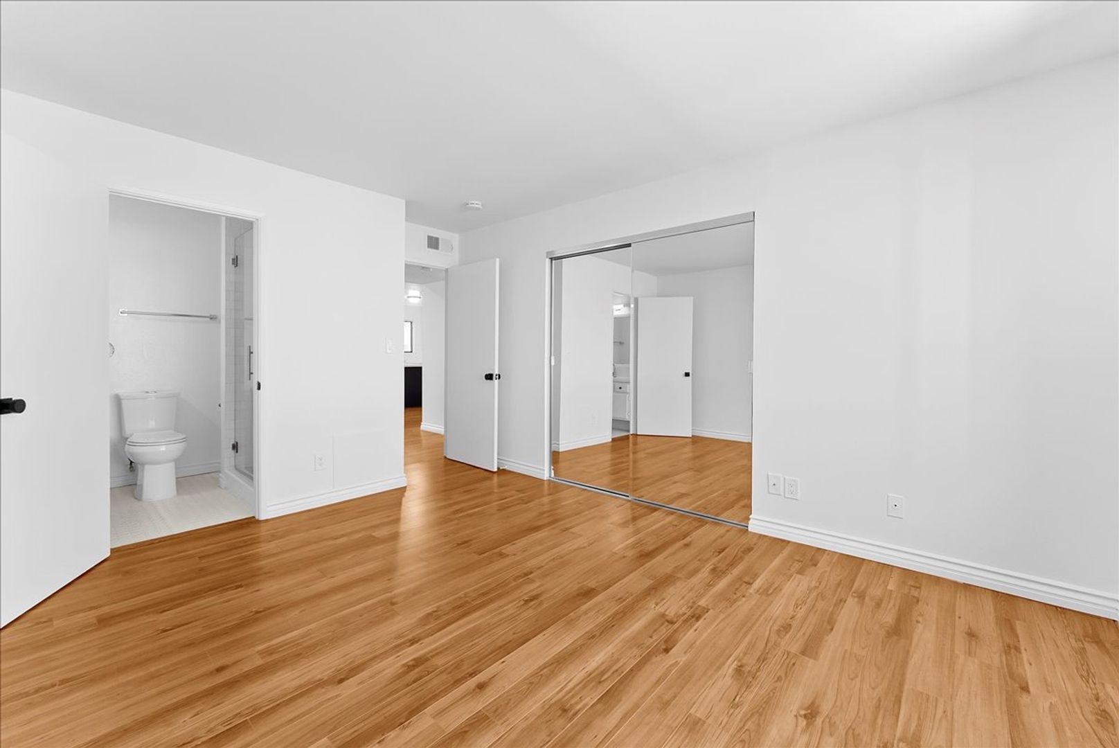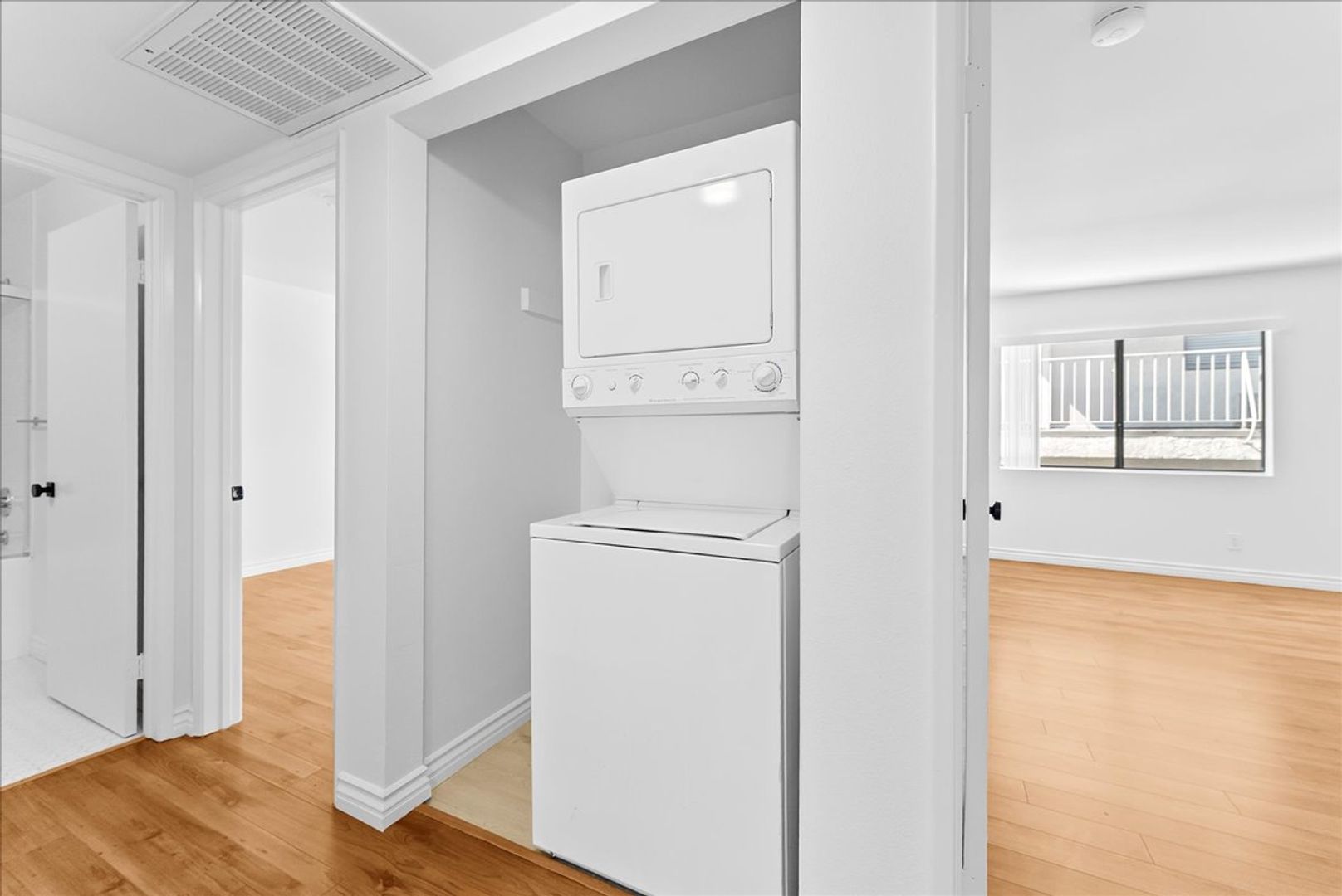 Beyond the kitchen, you'll find an expansive living and dining area—perfect for unwinding after work or hosting intimate gatherings with friends and family. Down the hall, you'll discover in-unit laundry for your convenience, as well as the main hallway bathroom. The two bedrooms are separated for added privacy, with the master featuring an en-suite bathroom and built-in closets with mirrored sliding doors.