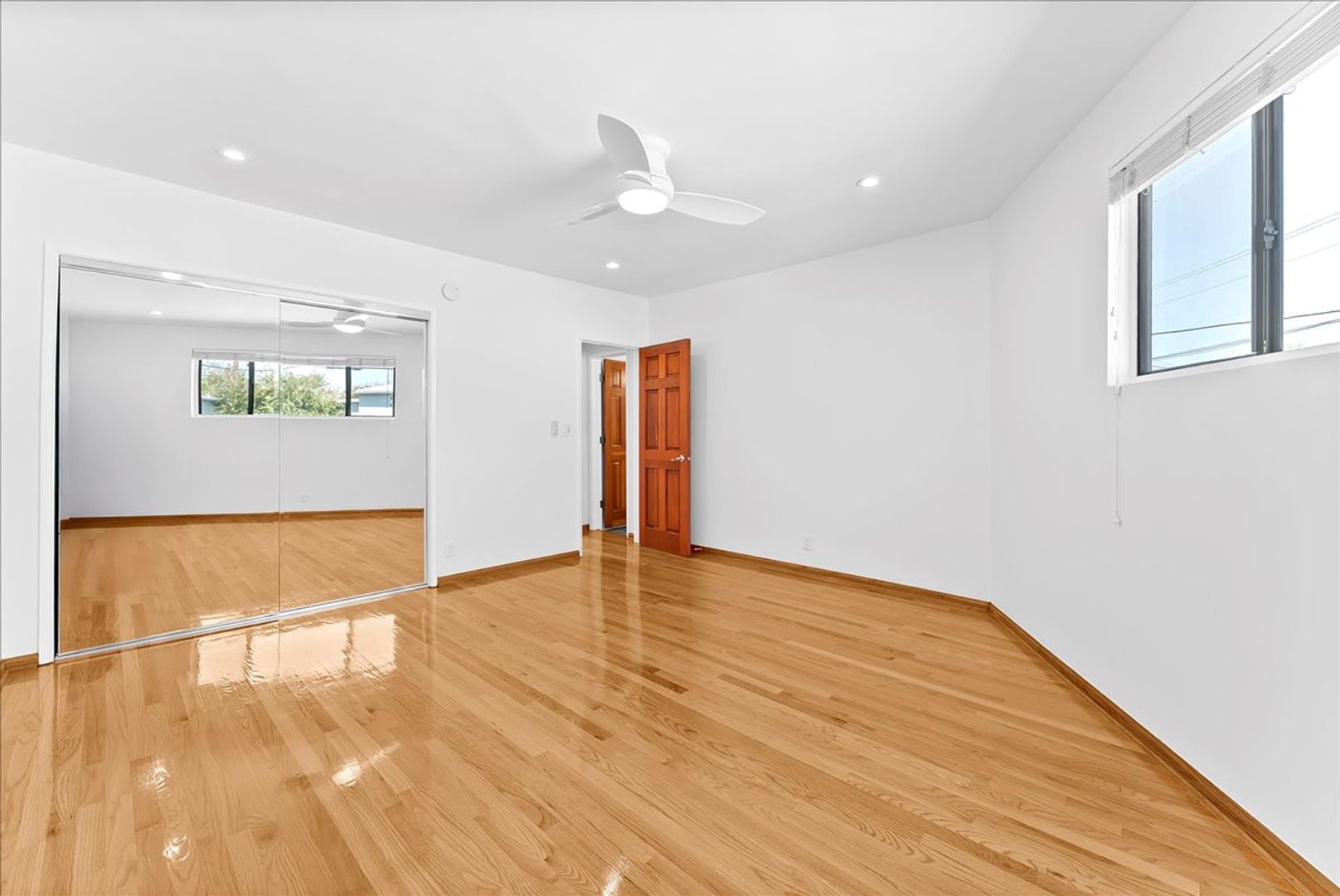 A stunning skylight stretches across the living room and kitchen, bathing the home in warm, natural sunlight throughout the day, complemented by large windows and ceiling fans in the living and dining areas for an airy, coastal feel. The generously sized bathroom includes an extra-large built-in vanity, while the spacious bedroom features mirrored sliding closet doors for added brightness and space.