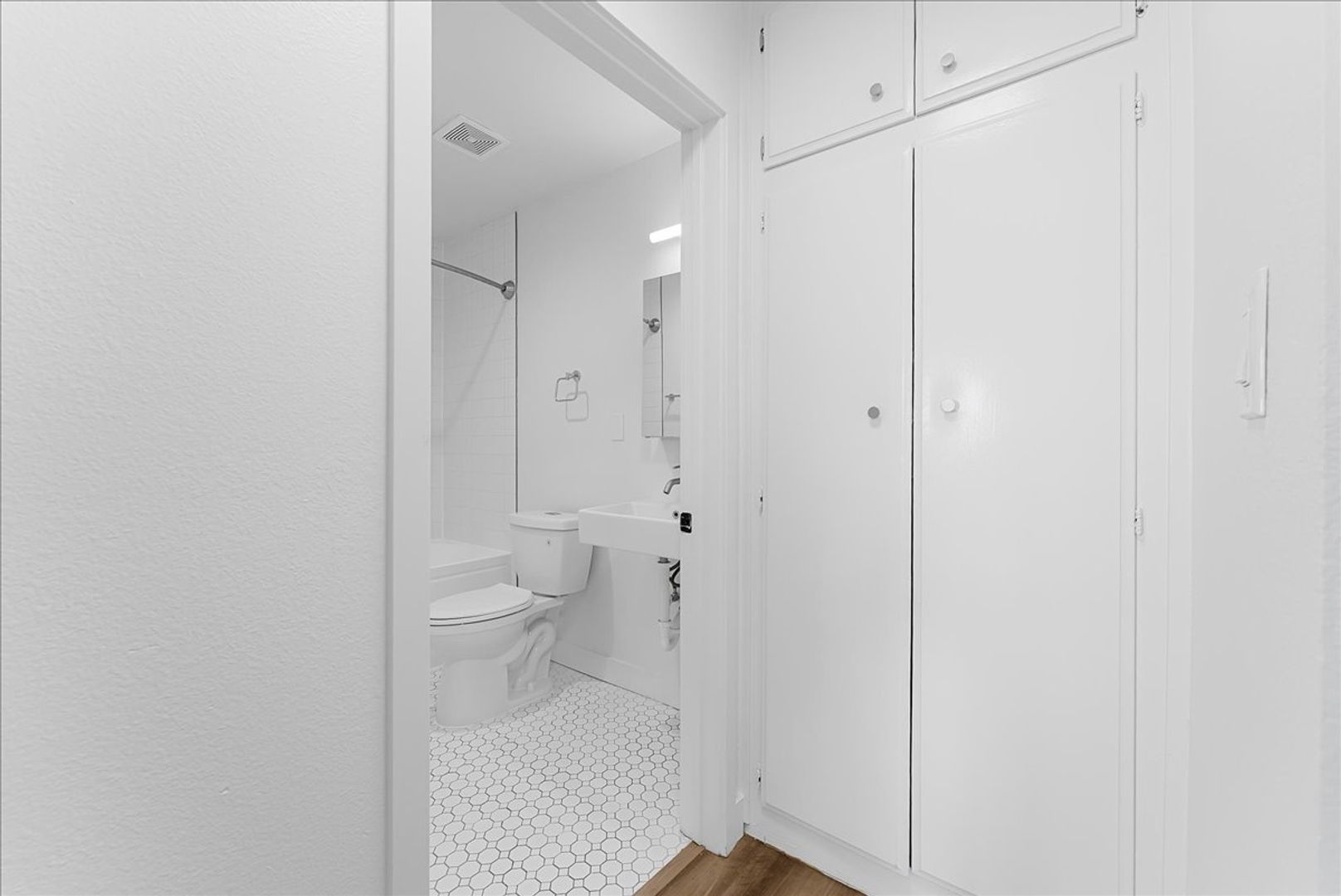 Down the hall, you’ll find extra storage closets, a modern bathroom with a shower and bathtub combo, and a large bedroom boasting wall-to-wall mirrored closets that make the space feel even larger. Additional amenities include gated parking for one car, on-site laundry facilities, and a controlled-access entry with intercom for peace of mind. Pets are welcome here—both dogs and cats—so your furry friend can feel right at home too.