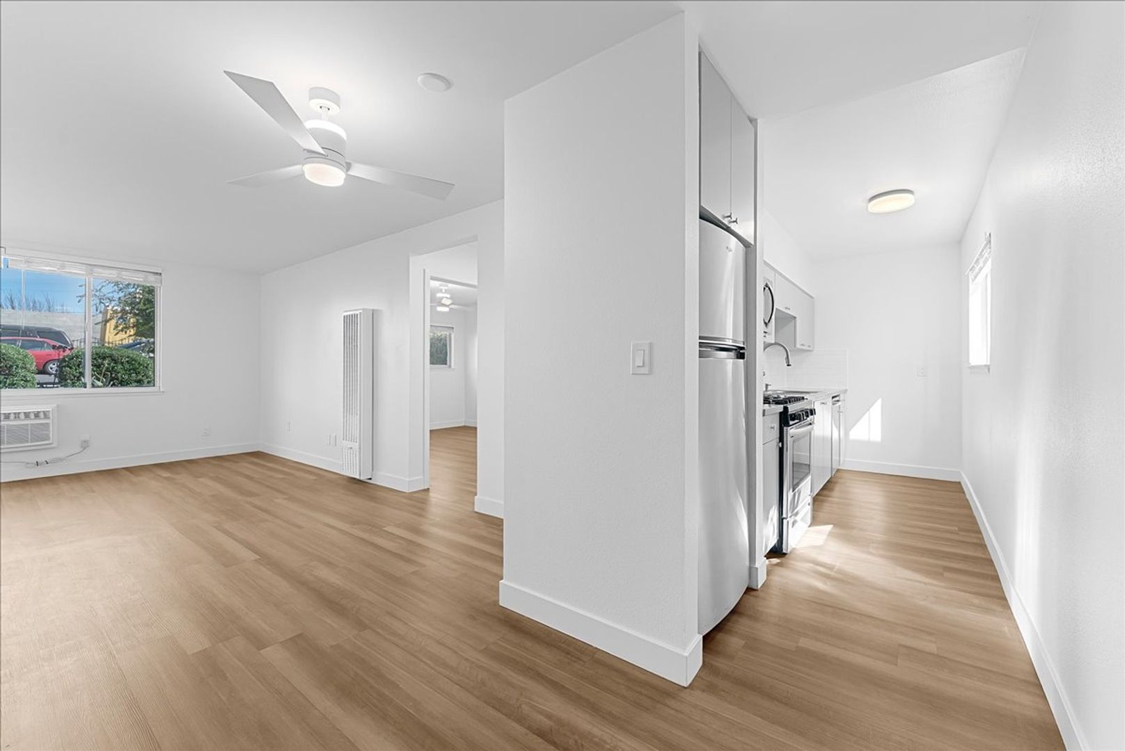 Welcome to 2736 Pomeroy Ave, Unit 105 — a bright and inviting one-bedroom retreat nestled in the heart of Boyle Heights. Perched on the third floor of a quiet, tree-lined street, this thoughtfully designed home offers the perfect blend of comfort, convenience, and contemporary style. Step inside to discover a spacious floor plan that feels open and airy from the moment you walk in. The alley-style kitchen features sleek stainless steel appliances—including a refrigerator, stove, microwave, and dishwasher—along with generous countertop space and plenty of cabinetry for all your cooking needs. Enjoy meals in the designated dining area under the gentle breeze of a ceiling fan, or unwind in the expansive living room, complete with a wall-mounted air conditioner and ceiling fan for year-round comfort.