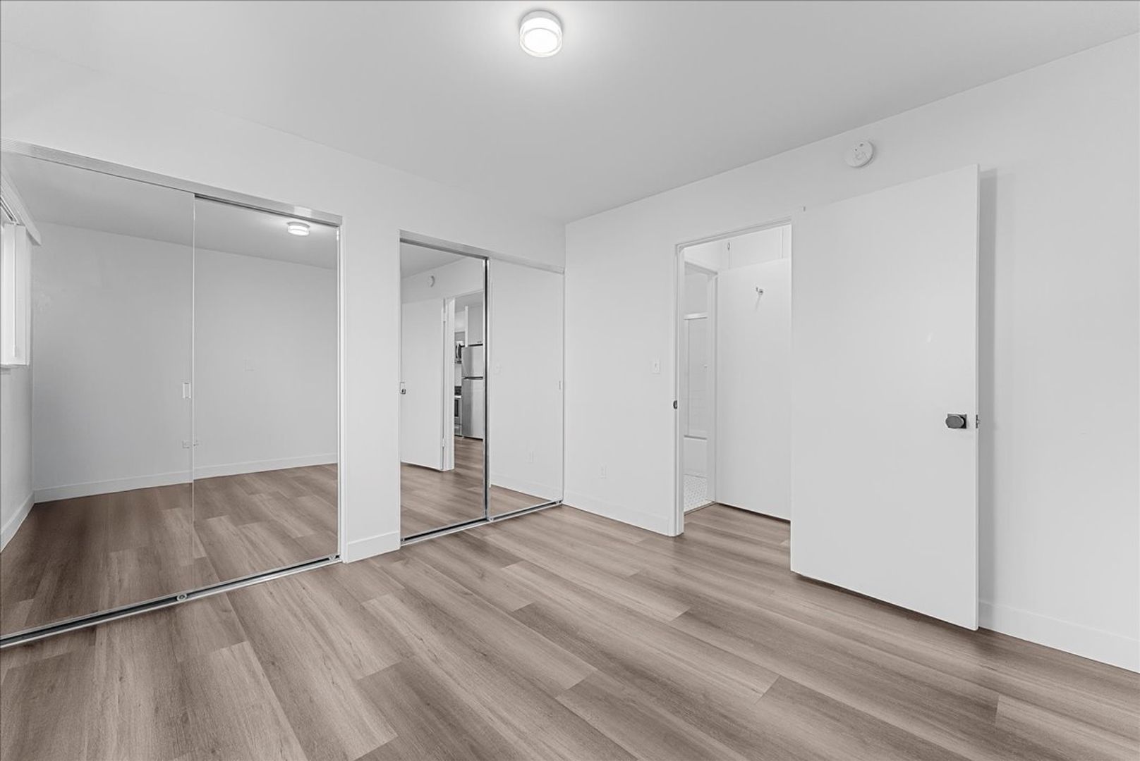 Down the hall, you’ll find extra storage closets, a modern bathroom with a shower and bathtub combo, and a large bedroom boasting wall-to-wall mirrored closets that make the space feel even larger. Additional amenities include gated parking for one car, on-site laundry facilities, and a controlled-access entry with intercom for peace of mind. Pets are welcome here—both dogs and cats—so your furry friend can feel right at home too.