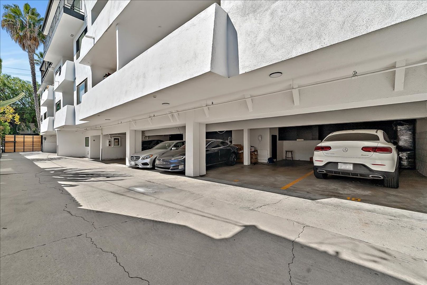 Additional features include central air and heat, secure building entry, and two assigned covered parking spaces in a gated lot.